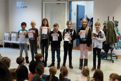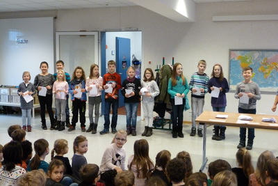 Auch 2017 haben wir im Rahmen des Sportunterrichts die Sportabzeichen abgenommen. Zusammen mit den Zeugnissen gab es am 02.02.2018 die Urkunde und das Abzeichen für die erfolgreichen Sportlerinnen und Sportler in Holzhausen, die ein Abzeichen in Gold, Silber oder Bronze erreicht haben. Herzlichen Glückwunsch! |