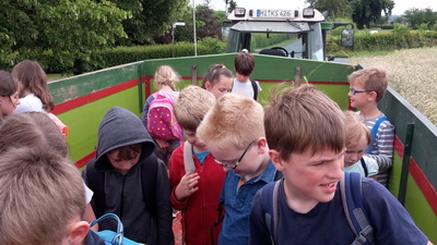 Bist du schon einmal Trecker gefahren? Wir schon, am 20.06.2018, zumindest im Anhänger. Mit viel Gekreisch ging es durch Felder und Wiesen. Damit uns nicht langweilig wurde und wir natürlich auch was lernen konnten, hielt Herr Schlensker zwischendurch immer wieder an und zeigte uns verschiedene Pflanzen. Hoffentlich können jetzt alle Gerste von Weizen und Hafer unterscheiden. Weißt du auch noch, woraus man Bier brauen kann? Während der Klatschmohn besonders hübsch aussah, duftete die Kamille sehr gut. Die Zuckerrübe müssen wir noch probieren. Auf dem Hof angekommen, begrüßten uns die Hunde überschwänglich. Dann hieß es erstmal auf der Wiese frühstücken. Das war auch gut so, denn nach dem Besuch im Schweinestall, hätten wir vielleicht nicht mehr essen mögen. Die Schweine sahen zartrosa und sauber aus. Gestunken hat es aber trotzdem. Ganz unruhig ging es im Hühnerstall zu. Das Gegacker nahm gar kein Ende und wie viel Eier die gelegt haben. Wahnsinn! Zum Schluss durften wir noch bei dem neugeborenen Alpaka vorbeischauen. Das sah vielleicht süß aus. Mit dem Trecker ging es wieder zurück zum Windrad und von dort gingen wir zur Schule zurück. Morgen wandern wir zur Freilichtbühne und am Freitag? Von uns aus, könnte es ruhig jeden Tag so weiter gehen.
