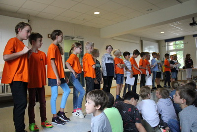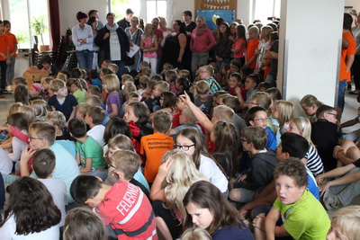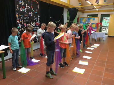 Am 13.07.2018 verabschiedeten sich unsere 4. Klassen im Forum bei ihren MitschülerInnen und LehrerInnen mit verschiedenen Darbietungen. Viele Eltern begleiteten ihre Kinder, von denen einigen der Abschied doch recht schwer fiel! Traditionell werden auch immer die Kinder besonders geehrt, die unsere Schule bei verschiedenen Wettbewerben (Lesen, Känguru, Schwimmen, Fußball, Handball, ...) vertreten haben. Die Sportlehrerinnen der 4. Klassen haben nach dem Sportfest schnell die Ergebnisse weiter geleitet, damit wir an diesem Tag die Sportabzeichen in Bronze, Silber oder sogar Gold überreichen konnten. Wir wünschen unseren "Abgängern" einen guten Start an der nächsten Schule!!! |