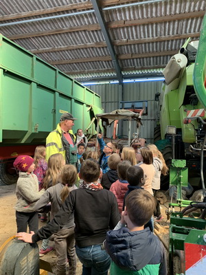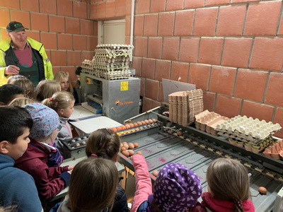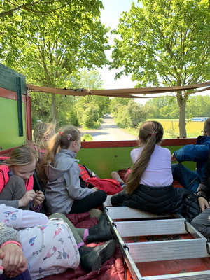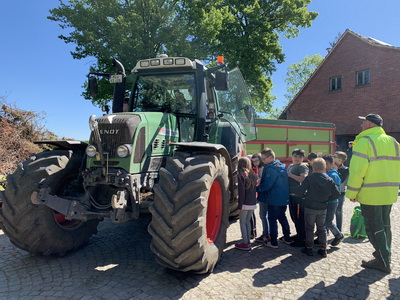 Auch dieses Jahr machten wir Zweitklässler unseren Klassenausflug zum Hof Schlensker. Bei bestem Wetter holte uns Bauer Schlensker standesgemäß mit dem Trecker ab. Die wilde Fahrt im Anhänger wurde durch lehrreiche Pausen unterbrochen, in denen wir verschiedene Feldpflanzen kennenlernten. Am Hof angekommen wurden wir von Hofhund „Lucy“ begrüßt, welche sich über besonders viele Streicheleinheiten freute. Als Erstes besuchten wir die Alpakas. Insbesondere das Alpakajungtier „Kurt“ war mit seiner feschen Frisur der Hit. Aber Achtung: Alpakas können ziemlich frech werden, wenn man sie bedrängt! Weiter ging’s im staubigen Hühnerstall. Mit einer Eiersortiermaschine wurden die Eier gewogen, nach Größe geordnet und gestempelt. Für die nächste Station mussten wir erst einmal tief Luft holen. Im Schweinestall fühlten sich die Tiere bei 25° sauwohl. Nach einer kurzen Stärkung mit selbstgebackenen Muffins vom Hof schauten wir uns die Maschinen an. Weißt du, was ein Mulcher und ein Grubber sind? Wir jetzt schon! Vielen Dank geht an Familie Schlensker für diesen schönen Ausflug, der uns sicherlich noch lange in Erinnerung bleibt.